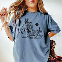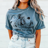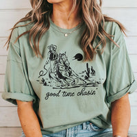Saddle up, cowgirl, and let your spirit roam free with our Good Time Chasin' Western Tee – a charming blend of rugged style and feminine flair. Crafted from soft, breathable cotton, this tee is as comfortable as it is chic, perfect for days spent under the big blue sky.