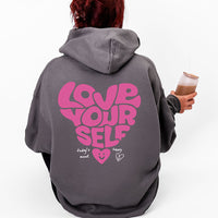 The Love Yourself Hoodie is a cozy reminder to lead with joy and kindness. Featuring a playful front graphic and a bold oversized heart design on the back, this hoodie blends feel-good energy with everyday warmth. Soft, relaxed, and easy to layer, it’s the perfect go-to for spreading positivity wherever life takes you.