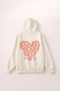 The Love Yourself Hoodie – Bone pairs soft neutrals with a joyful reminder to celebrate who you are. Featuring a playful front graphic and an oversized heart design on the back, this hoodie blends cozy comfort with an uplifting message. Warm, relaxed, and effortlessly wearable, it’s a feel-good staple designed to spread positivity wherever you go.
