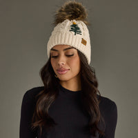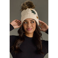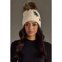 Top off your holiday look with the Beige Cable Knit Pom Hat with Embroidered Tree. A cozy winter accessory that blends festive spirit with timeless style. Featuring a soft cable knit design, a warm fleece lining, and a fluffy natural faux fur pom, this beanie is as practical as it is cute. The embroidered green Christmas tree with a golden star adds a subtle festive touch, perfect for the holiday season.