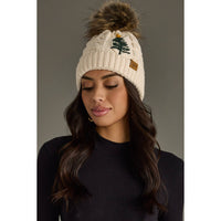 - Design: Cable knit with natural faux fur pom