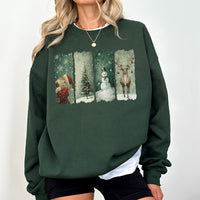 If your holiday aesthetic lives somewhere between vintage Christmas cards, snowy winter nights, and cozy cocoa-by-the-tree vibes... this is the sweatshirt for you. Featuring four nostalgic painted panels (Santa, a decorated tree, a snowman, and a red-nosed reindeer), this forest-green crewneck feels like stepping into a classic holiday storybook.